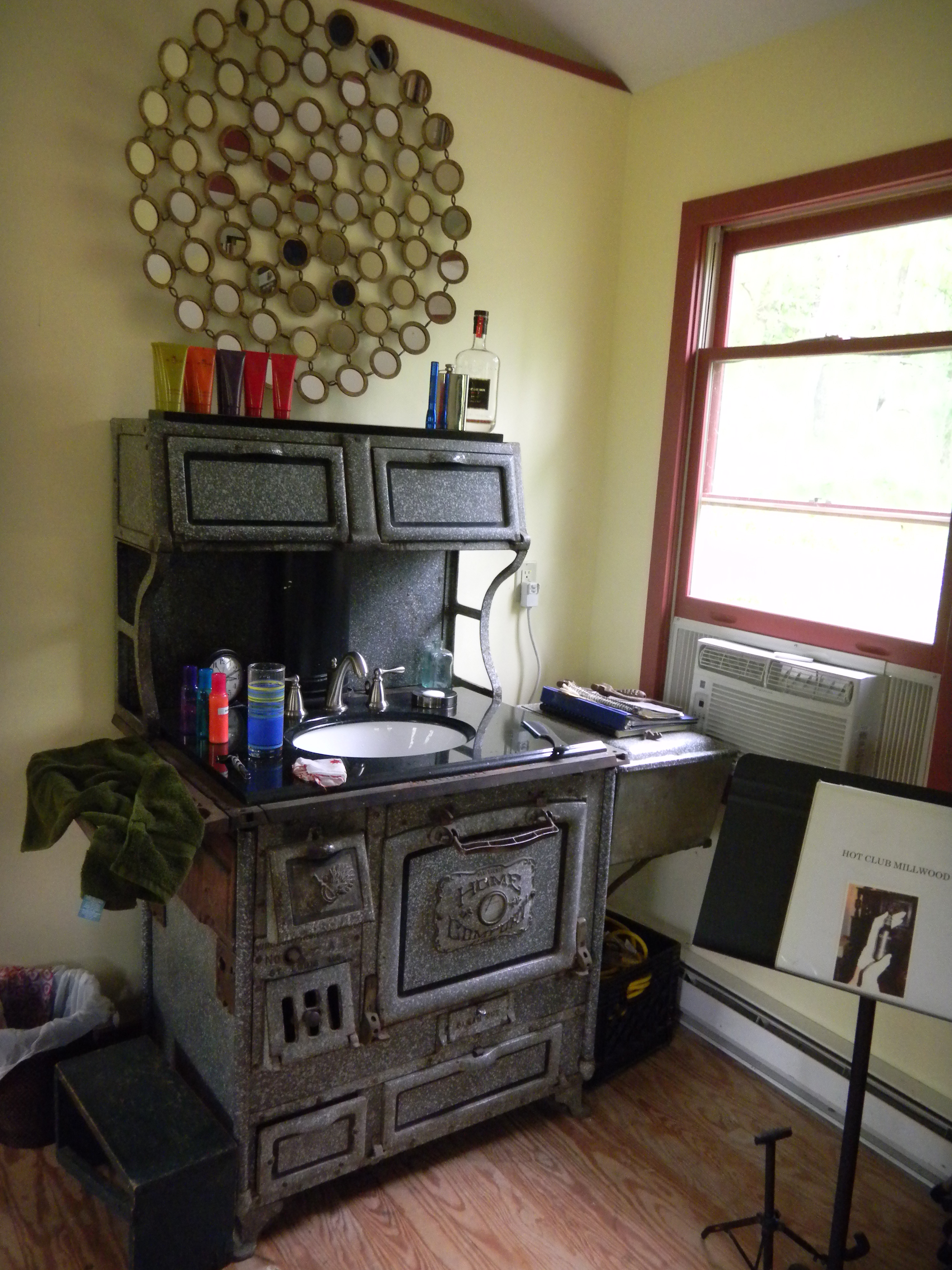 Check-in Saturday evening was a snap – no fussy paperwork to fill out or anything! We stayed in the guest house, which is complete with a piano, a large globe, and the famous coal stove. The B&B is named for its ingenious sink installation, pictured here at the end of our stay. The mirror above gives the user a Cubist’s view of her or his face; of course, there’s a normal mirror in the bathroom.