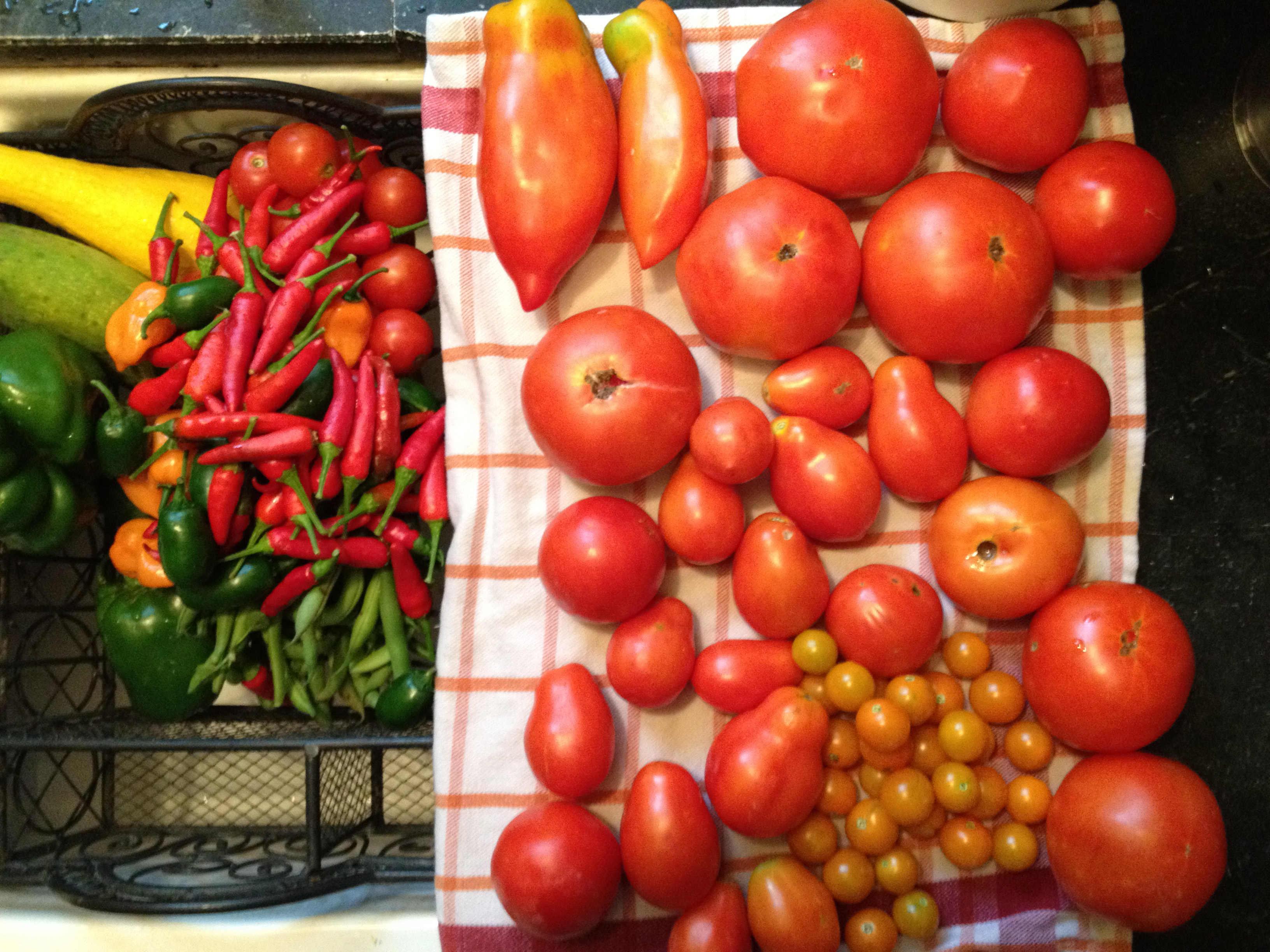 … are thunderstorms and tomatoes. Fortuitously, this visit to the guesthouse brought both on the same morning! The second morning of my visit found me, as most mornings spent on the east coast do, far from hungry for breakfast. Forget sleep, shifting meal times pose the biggest challenge to this traveler. Thank goodness the guesthouse comes supplied by a lovingly tended (if somewhat scorched, thanks to the record-setting heat) vegetable garden featuring a plethora, from which I sampled: tomatoes, various chilies, white corn, spring onions, and a variety of herbs. Here’s just small sampling of what we enjoyed:
